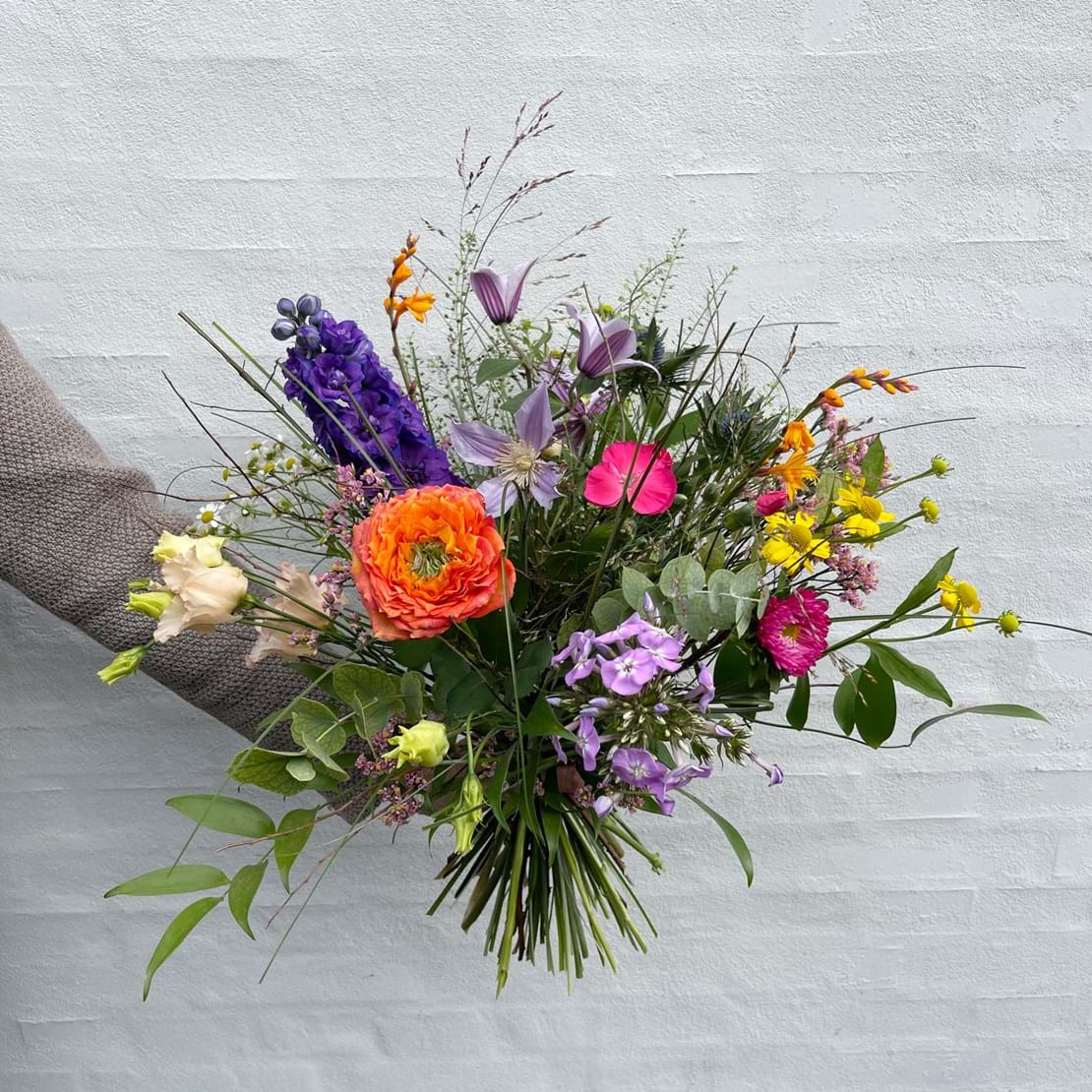 Naturlig, let markbuket, bundet højt og vildt af årstidens blomster.