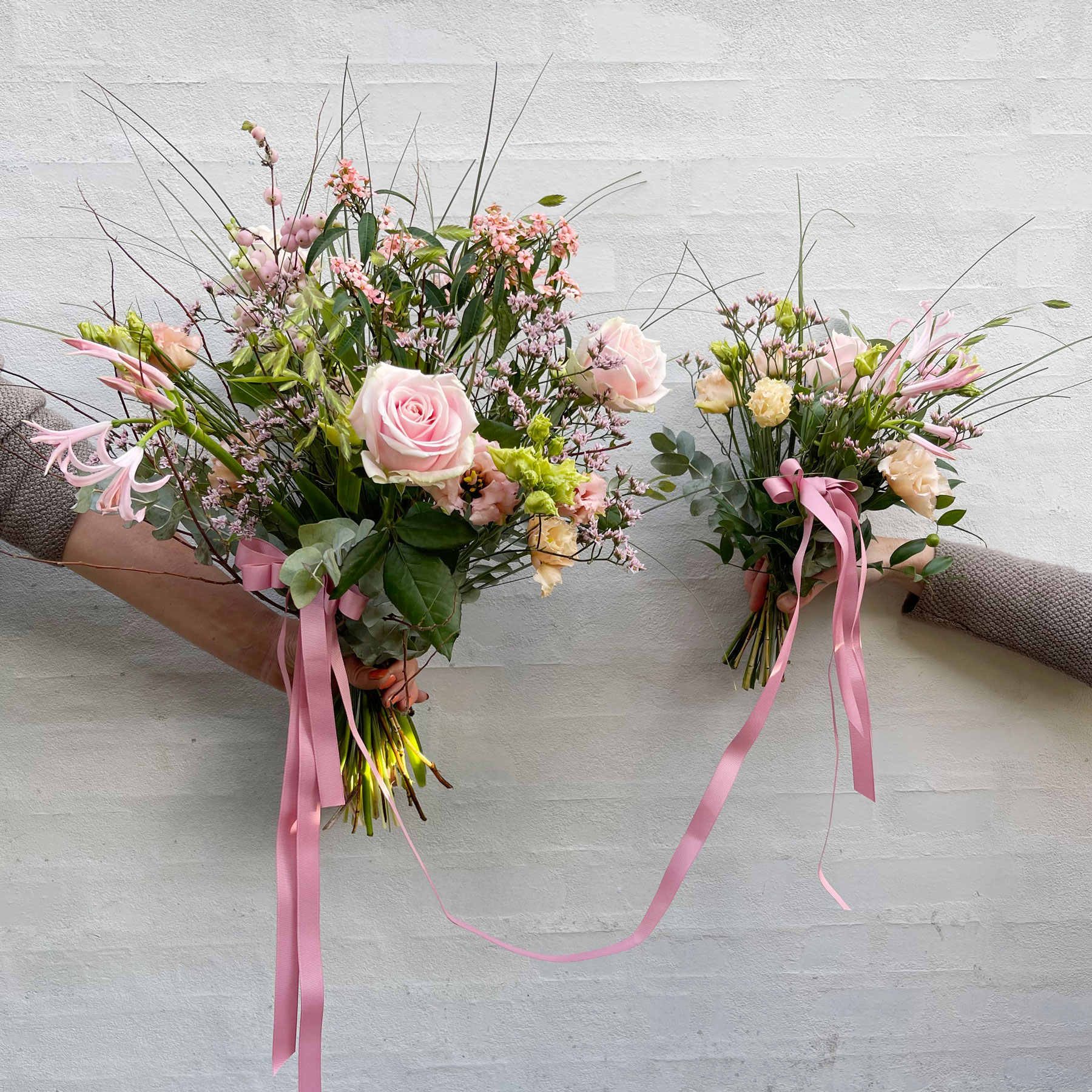 Naturlig, let mor & barn buket bundet højt og vildt af årstidens blomster.